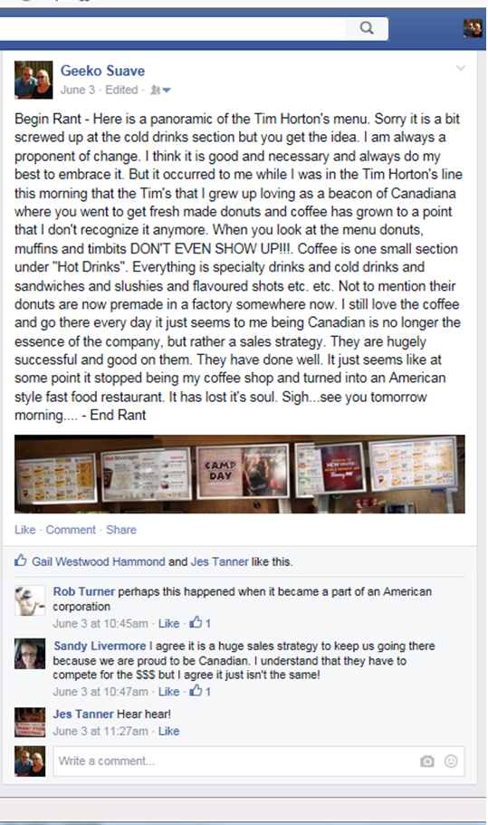 Back to the point of this original post, I reiterate that Tim’s is not the company it was when we as a mass of Canadian’s fell in love with it. It has become a soulless corporation that has sold out (twice) while exploiting the blind loyalty of the Canadian public that made it grow to the company it is today. I am repeating myself, I know. To fact check the original post I went into Tim’s and watched the menu screens and sure enough doughnuts do not appear on the menu. Go in and check it yourself.